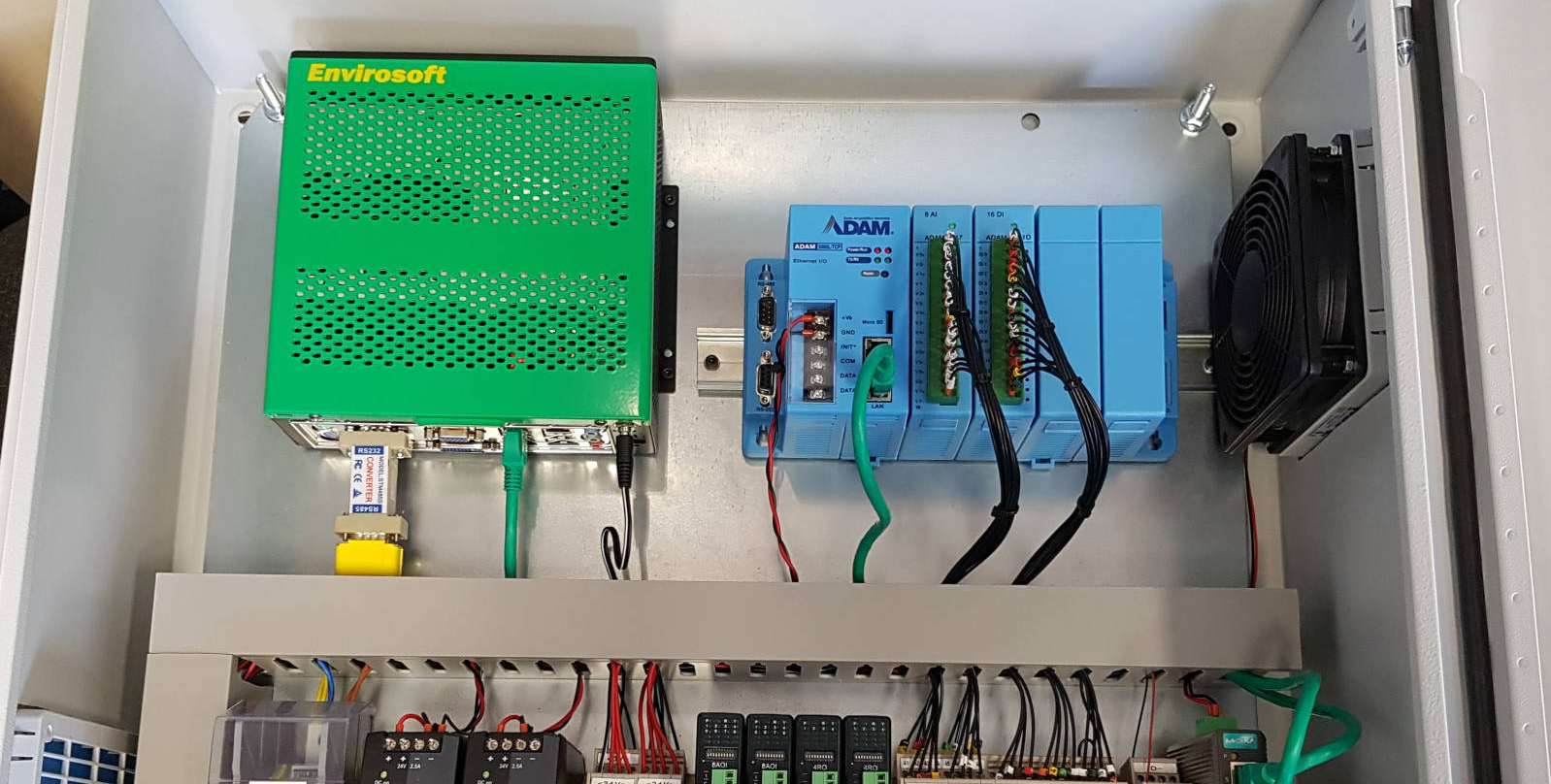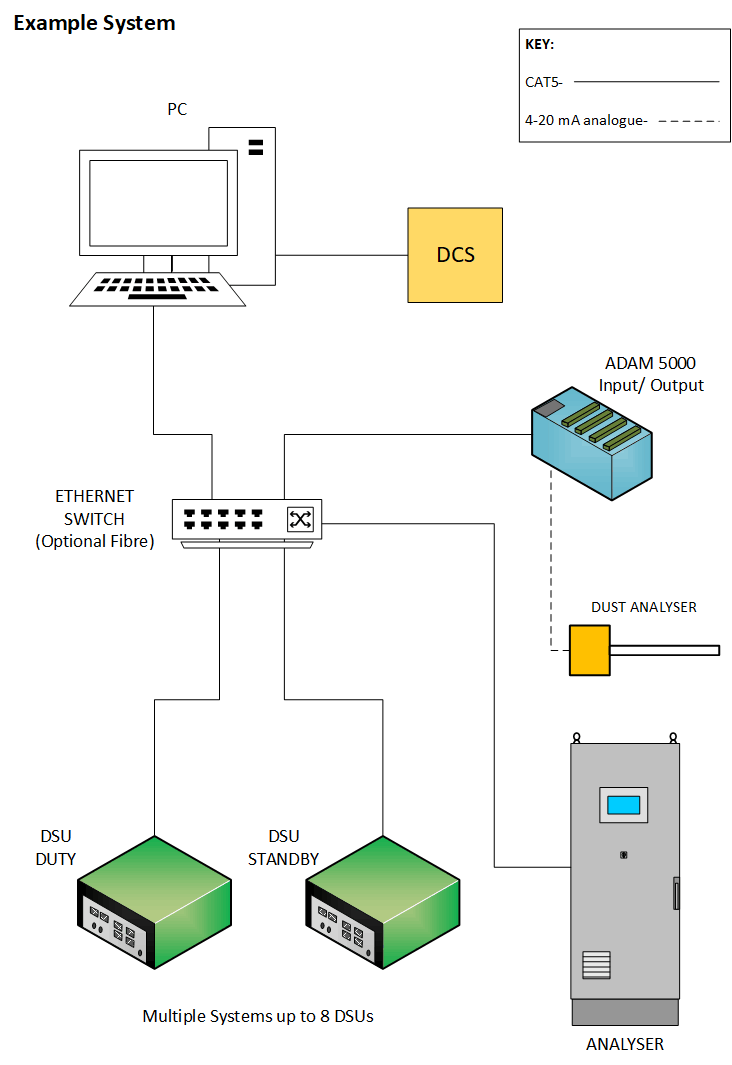 For most systems, DSU(s) obtain data from field instruments via direct communications, but data may also be acquired using I/O interface modules. Our systems are built according to the analysers and instruments on plant, and the available communications protocols from these sensors. If direct communications are not available, Envirosoft utilise the proven Advantech ADAM modules, either serial (RS232 or RS485) or Ethernet. The advantage of the Ethernet base units is that multiple computers can access the data. RS485 units may be useful for remote I/O over long distances (>1 mile) and can use existing site analogue cables. The ADAM I/O base units are expandable with individual I/O cards, and analogue and digital inputs are acquired by the DSU, where the primary data is stored before onward transmission to the Data Acquisition System PC(s). Where analogue or digital retransmission is a requirement, output cards may be fitted.